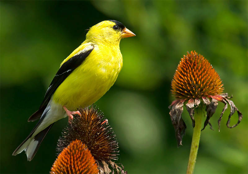 People lucky enough to have goldfinches in winter know spring is coming when a patchwork of brilliant feathers starts showing through the drab winter plumage. Pleasant as these hardy birds are in winter, American Goldfinches are their most brilliant during the season of abundance, summer, when watching them can make us feel as rich as if their plumage was real gold.