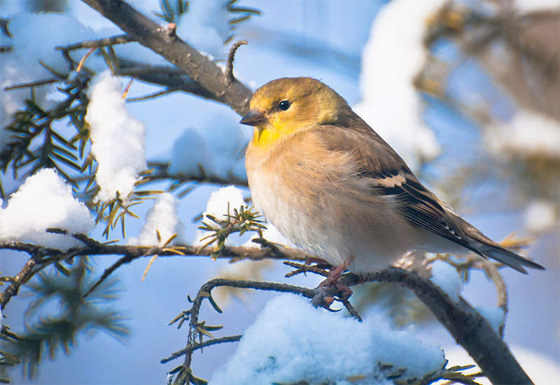 American Goldfinches are an exception to this system. Their winter feathers are exactly what they appear to be: dull feathers through and through. In early spring, goldfinches replace their body feathers one by one, growing new, brilliant breeding feathers that they’ll keep until late summer or early fall.